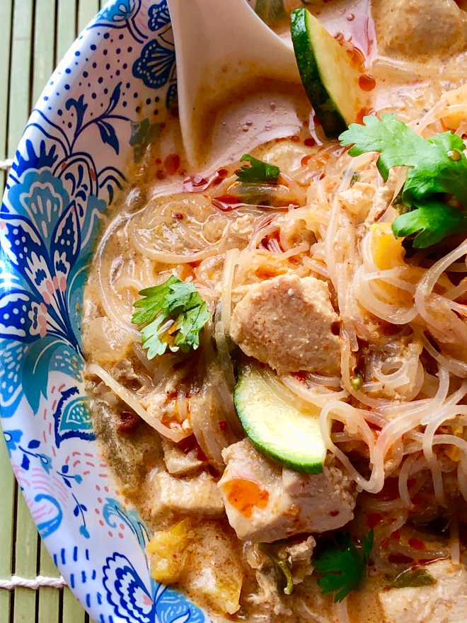 This soup makes for a fabulous dinner year round.  Chock full of flavor, it’s both sweet and savory, satisfying the senses and filling your tummy.  The soup can be made vegan by using vegetable broth in place of chicken broth and changing out the chicken for extra firm tofu.  Feel free to use the vegetables you love like carrots or broccoli, whatever floats your boat.  The recipe calls for sambal oelek, a chili paste or sauce, and is optional but try to get your hands on some if it’s not available at your grocery store.  It gives the soup so much more flavor as it’s loaded with garlic, shallot, ginger, lime juice and other tasty ingredients.  It also adds some heat so taste and test as you add.  Both the rice noodles and the fish sauce can be found on the international aisle in the Asian section of your supermarket.  I know this sounds weird but this soup tastes really good cold!  Enjoy this Thai red curry chicken soup  with both chop sticks for the noodles and a soup spoon for every drop slurpy goodness.