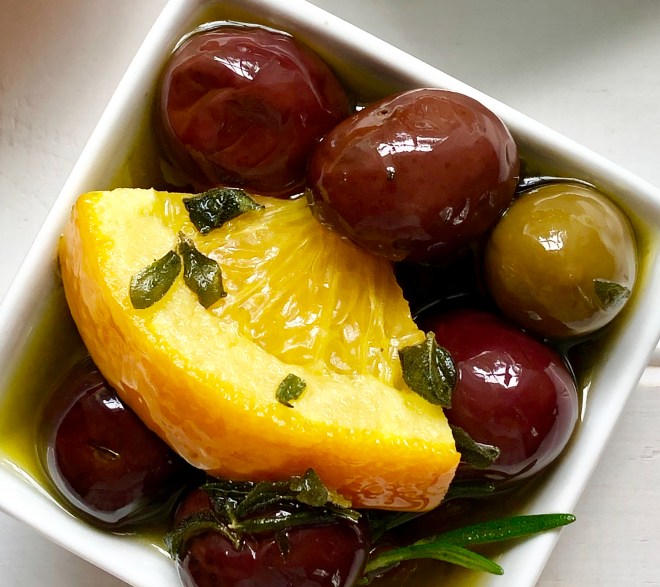 This recipe is ridiculously easy and fabulous to serve when you don’t want to leave the house and run to the store one more time, all the ingredients are found in your kitchen and you’ve got a couple of hours. Quite frankly, they are delicious freshly made but the longer the olives sit and marinate, well, they only get better. Oregano and rosemary are widely used in Greece but feel free to change the up the herbs. Fresh marjoram would be lovely as would fresh thyme. I buy my olives often at the grocery store olive bar and if they only have olives with herbs already on them I simply rinse them off at home. I prefer to use fresh herbs that I recognize. Serve the olives with good grilled bread, perfect to sop up all that fragrant olive oil.