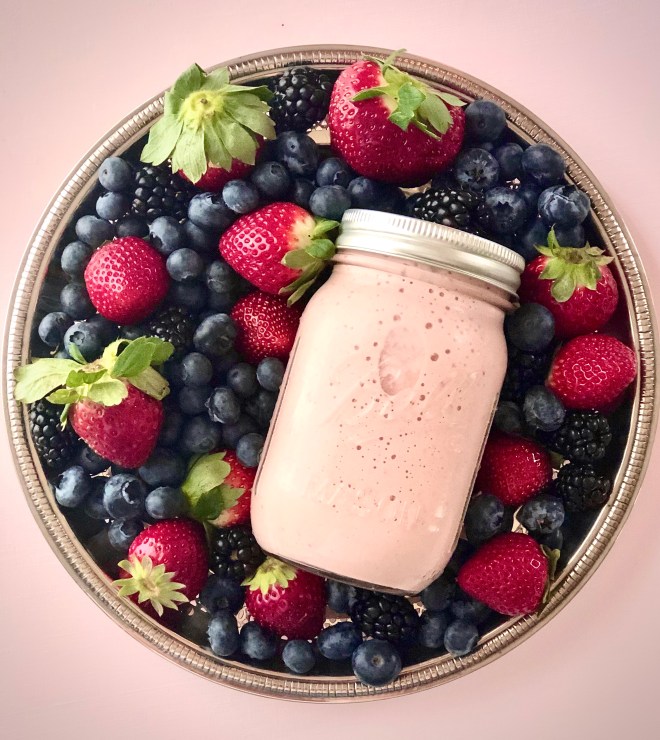This so-good smoothie has almost saved my waistline. Chock-a-block full of fibre, vitamins and minerals, this smoothie will hold you in good stead, chasing away any hunger pangs for hours after drinking. Peanut butter powder is found in the nut butter and jelly section of your grocery store. Straight forward and direct, this powder tastes only of peanuts; there’s no funky aftertaste. Here’s the best part. Peanut butter powder has 70% less fat and calories than conventional peanut butter. 70%! Pretty great numbers, huh? The oats called for make a thicker smoothie, help fill you up and keep you satisfied. I use low-fat and low-sugar yoghurt, sometimes vanilla or strawberry flavored. If I prepare a strawberry PB&J smoothie I add closer to 1/2 cup of oats. Blueberries are not as juicy so that smoothie would call for less oats. I use almond milk, Elmhurst to be specific, but any kind of milk may be added from whole cow’s milk to coconut or any of the nut milks on the market. I sprinkle a little stevia in my smoothies to sweeten them up a bit but any sweetener you wish to add is fine. The peanut butter flavor is strong and savory, coupled with fruity berries, well, this PB&J treat will make you feel like a kid again.