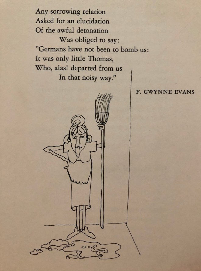 ‘His old nurse cried, much disgusted, “There, just when I’ve swept and dusted, drat the boy! he’s gone and busted, making such a mess”; while the painful task of peeling Thomas off the walls and ceiling gave his family a feeling of sincere distress.’  Ha.  The pen and ink illustration accompanying the poem showed his scowling, skinny old nurse, broom in hand, standing before a puddle of his innards, a of couple of veins floating around in it.  I can’t tell you how many hours I have spent staring fascinatedly at those veins.  I literally laugh out loud, I chortle at her look of irritation.  Here, I’ll show you.