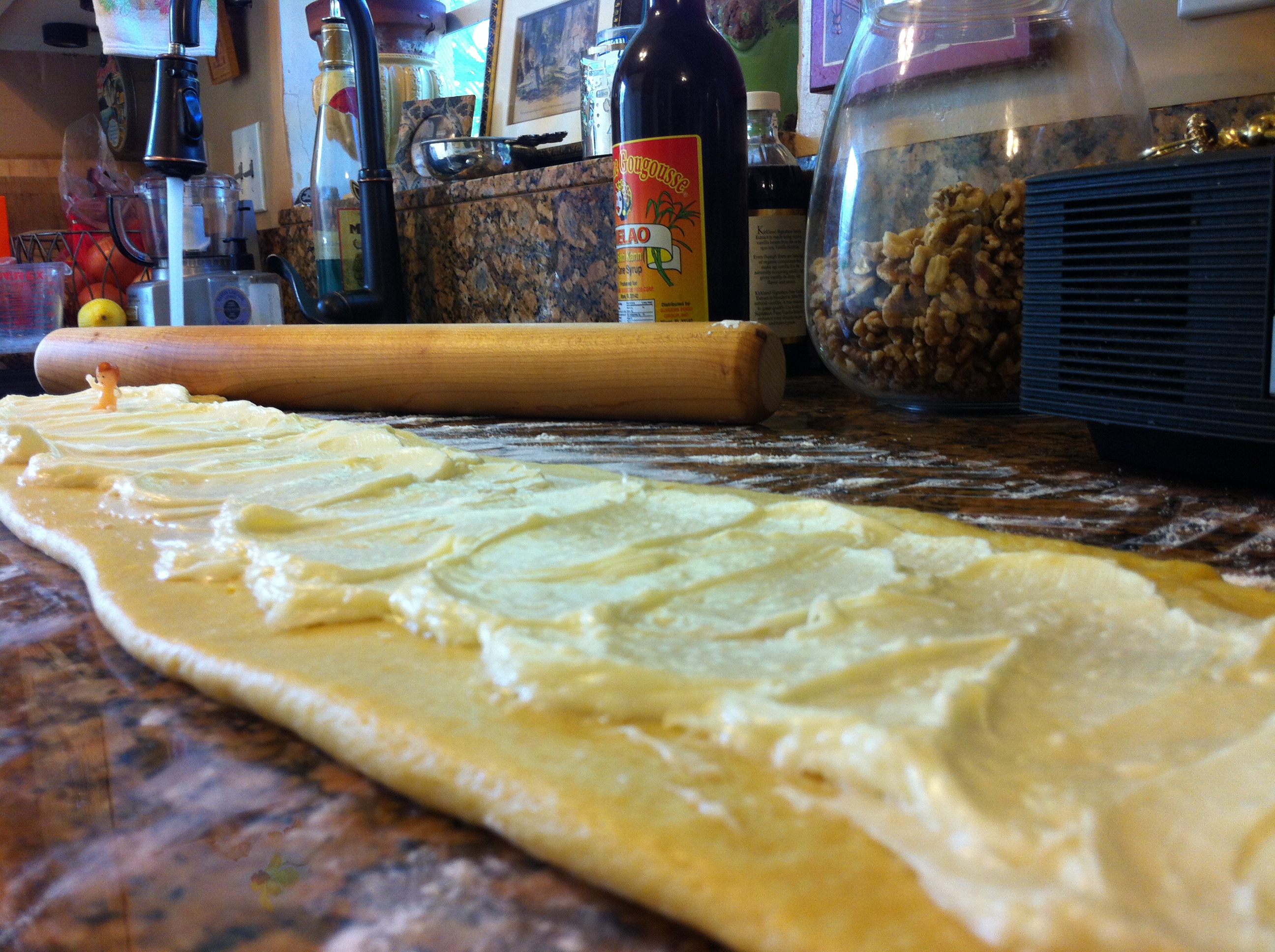 10. Spread the cream filling on dough leaving a one inch border without filling.