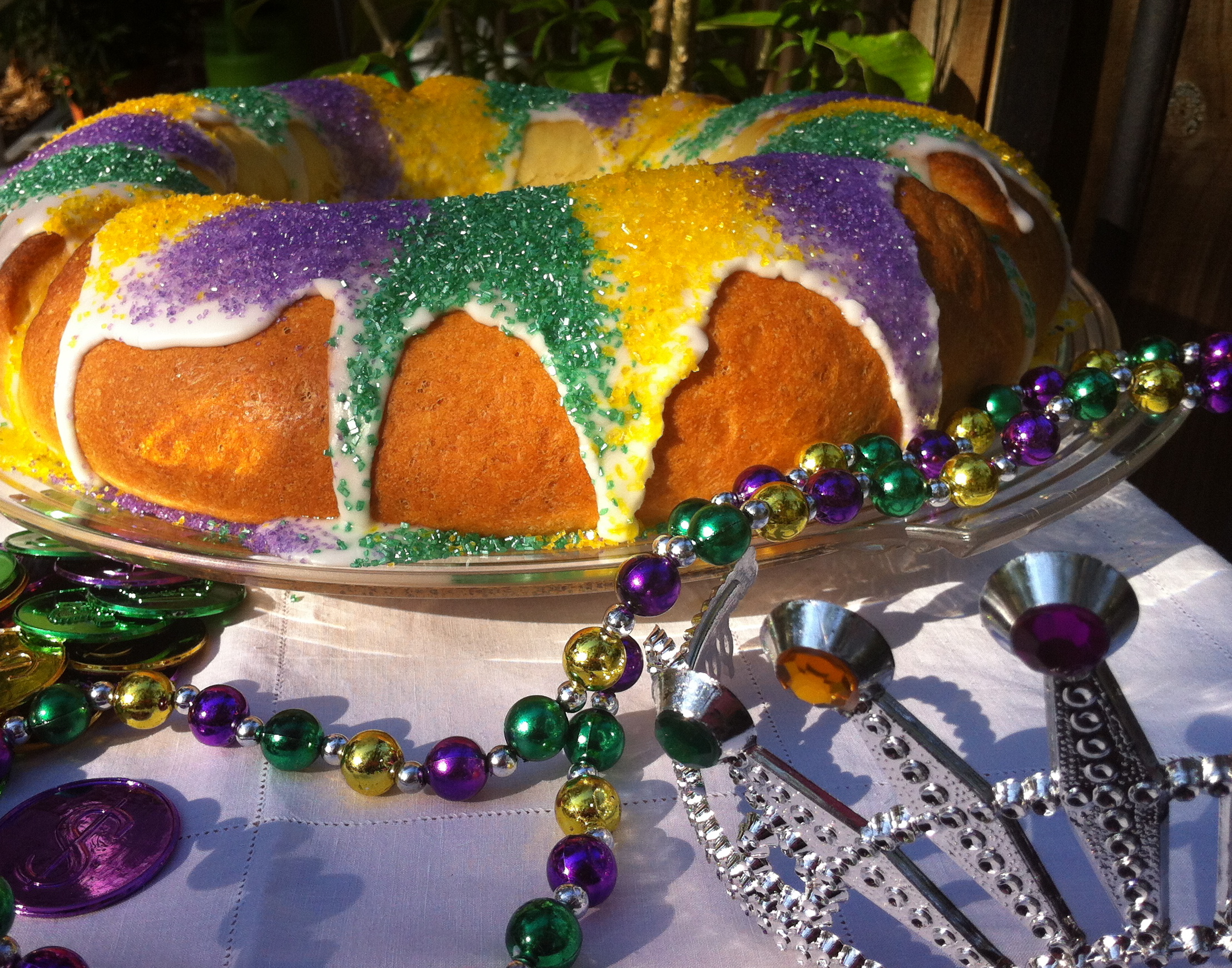 We’re slap dab in the middle of New Orlean’s Carnival celebrations and King Cake Season  culminating today, Fat Tuesday..Mardi Gras, y’all!  Everyone in Louisiana has King Cake, in their office, school, home, they are everywhere!  And King Cake parties abound.  Gold, green and purple seem to be everywhere.  Why?  Because gold represents power, green represents religion and purple signifies justice.  It’s also a really great color combination. Anyway, King Cake is more like a coffee cake or sweet yeast bread than a true cake.  King Cakes truly epitomizes New Orleans.  I’ve been in New Orleans only four times.  The first time I went was with my parents for a family reunion, specifically Daddy’s French side of the family.  We were joined by Dad’s sister, Aunt Sunny and her husband.  I was named after my paternal grandmother Alice as was Aunt Sunny.  The family plantation, Magnolia Mound Plantation, is situated on the banks of the Mississippi River in Baton Rouge.  It was in my paternal grandmother’s family through the mid-1800’s.  It passed through many hands after it was lost.  During the time of our reunion Magnolia Mound had been rescued by the Junior League of Baton Rouge who gave great tours and gave visitors an authentic feel for life in the deep south of the 1800’s.  At the reunion we had crab boils with locals playing some really jumping Zydeco.  Other nights we could be found laughing and dancing on the house lawn under the stars drinks in hand…with enormous cauldrons of gumbo bubbling close by.  At linen draped tables nearby were silver salt cellars filled with file gumbo, (pronounced fee-lay), baskets overflowing with hot French bread and little crystal tubs full of spicy, cold homemade Tabasco butter.  It was jollification at it’s best.  But when we hit New Orleans a few days later…well!  That was when I thought the fun really started.  Brunch at Brennan’s with many, many Bloodys. And the shopping after. Oh, my goodness.  Mom and I had fun on Royal Street antiquing and then made our way over to Magazine Street for more shopping delight.  And delight there was.  Mama had made plans earlier to meet up with Daddy, probably to give him all our shopping bags, and that was the exact moment I found it.  The most  exquisite little lingerie boutique you could ever imagine.  Everything inside, EVERYTHING, had been hand-made in France with the finest silks and laces.  With no one to stop me –  I went craaazy.  Beautiful ensembles in peach, pink and cream.  Handmade silk and satin garter belts, pure silk stockings, handmade Irish cotton night-slips, teeny lace panties…as a size four I went crazy.  Then out of the corner of my eye I saw Mama and Daddy strolling towards the shop.  The shop girls quickly rang up my sale, packaged it in tissue and ribbon and I scuttled out before Mama and Daddy could see what I was buying.  They never said a word and they didn’t exactly know what I was doing but they knew I was up to no good when I wouldn’t meet their eyes.  No worries.  We were off to Antoine’s for champagne and another family party.  Laissez les bons temps rouler!  Let the good times roll!