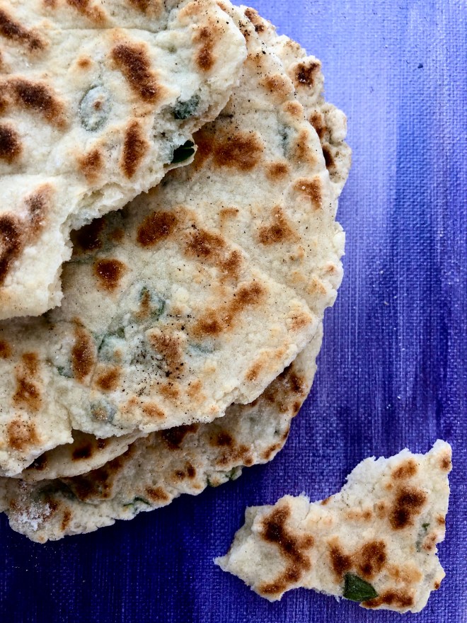 We don’t really keep bread in the house anymore. Oh, sure, we have our super high fiber English muffins for breakfast but, other than that, there is no bread to be found in the cupboard. Often, though, I really enjoy an enormous salad for dinner, chock full of all kinds of bits and pieces… chopped strawberries or pears, maybe some chopped, toasted almonds or pecans, always a handful of sliced spring onion and a sprinkling of crumbled goat cheese or gorgonzola all mixed into a massive bowl of mixed greens. But that gorgeous salad is missing something. Dinner salad in my house needs bread… good bread, not sandwich bread. What to do? Because at the end of the day ain’t nobody got the time or the energy to knead dough and let it rise and blah, blah, blah. And I’m not keen on buying artisanal bread because there is always 3/4 of a loaf left over and that is pure temptation for me. This homemade, easy flatbread is absolutely perfection.