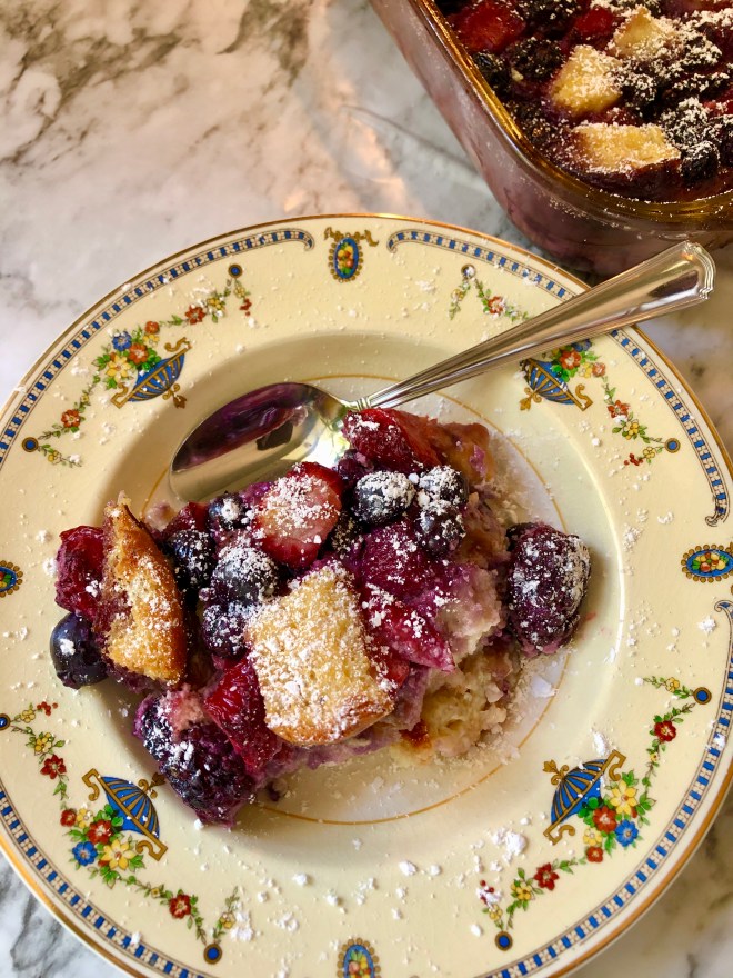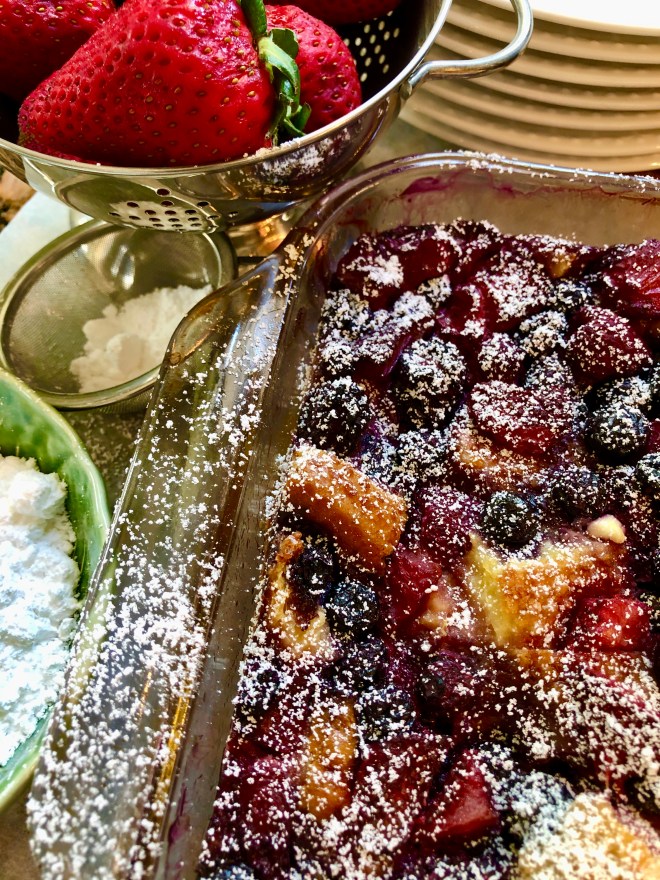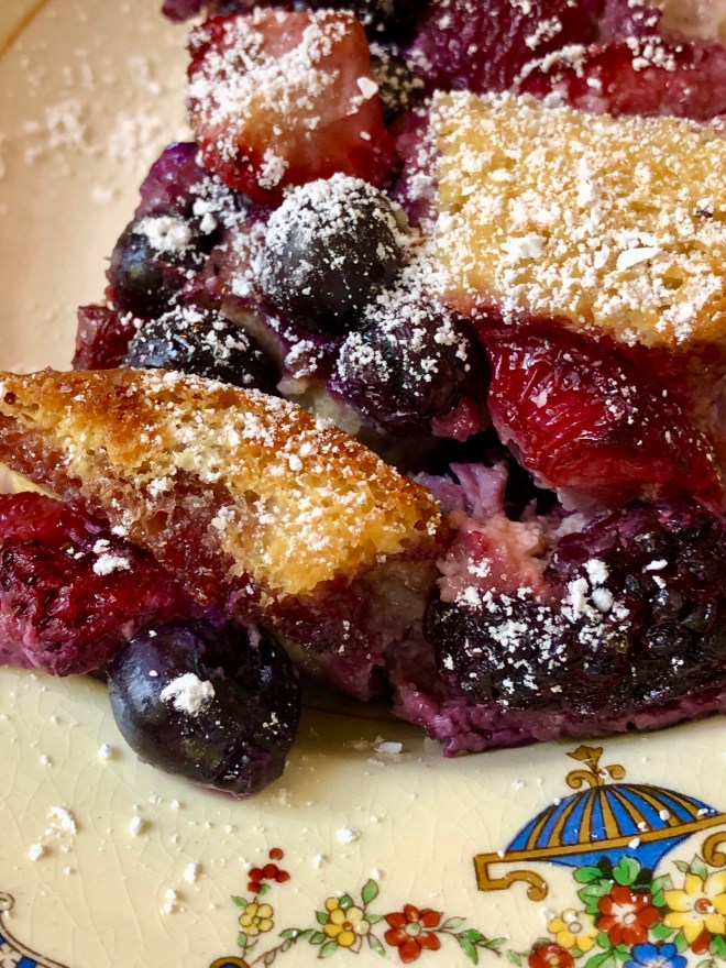 The egg, milk and bread transform into a creamy, silky sort of custard, luxuriously rich and satisfying. Cream cheese gives the custard not only heft but also a smooth, mild savoriness. This breakfast bake is bursting with fresh berries; whatever combination you desire works and works well. These beautiful berries cut through the lush, full-flavored cream cheese custard with a volley of flavors, from the raspberries to the blackberries and strawberries, all the fruit explodes with juice and flavor brought out by the heat of the oven. Any type of milk may be used such as whole, 2% or skim. I’ve also used almond milk, Elmhurst brand is splendid. It’s a little costly but it’s thick, unsweetened and and is made with only TWO, two ingredients: almonds and water. So if you find it on sale, try it. And no, I’m not getting paid to push Elmhurst, it’s just that good. The best bread I’ve found is a cheap loaf of Italian bread from your grocery store’s bakery. I don’t even worry if it’s not yet stale because it will provide the perfect consistency for this kind of bake. The bread in the photos cost me a total of $1.99. Nice, huh? I always buy organic eggs and with the corona virus on us, I’m finding all kinds of farmers with lovely, pastel-hued organic eggs. I guess that’s one good thing that has come out of this pandemic, along with many other blessings. I think we’ve all had the time at some point to look around and truly see how dang fortunate we are. I’m talking from appreciating the kitchen being cleaned every night by my spouse because I prepared dinner, to taking a long, laser sharp, unemotional, impersonal look at that man and marveling that, when all is said and done, we have a pretty strong marriage after 31 years. These are some strange days, y’all. Strange indeed. Hence, I for one, will continue Monday through Friday on the straight and narrow, completing my 4-mile workout everyday, enjoying endless yard work and gardening and keeping our diets low-fat and seriously plant-based. Again, that’s Monday through Friday. When the weekend finally rolls around, I look forward to that nocturnal moment when my head hits the pillow and I’m pleased and content in the knowledge that tucked deep within the chilly hollow of my refrigerator I have the morrow’s brunch done. Boom.