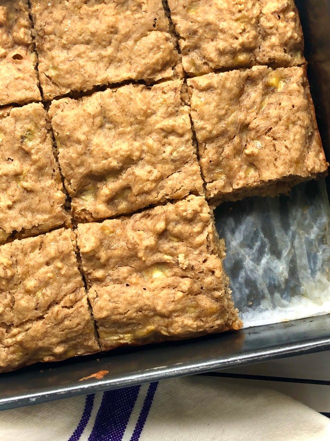 Hey, y’all!  We’re all still quarantining and if there is anything which has been reinforced for me during this period of self-isolation is not to waste.  Food has become a much more precious commodity.  On those few days we venture forth to the grocery store again and again we find meager supplies of eggs, bread, chicken, milk and coffee.  Actually, the list could go on and on depending on your region of the country so I believe we’re often making do with what we have.  The old adage, ‘waste not, want not’ comes into play on an almost daily basis.  I recently picked up some bananas for my family.  Most were consumed, however, three sat in a basket becoming more and more ripe as the days flew by.  I knew they wouldn’t be eaten as bananas have to be almost green for my husband to tuck them away.  This morning I finally admitted to myself if I didn’t use them NOW they would have to be thrown out.  And throwing out food hurts me to the core.  When my father was alive I baked this quick treat often for him.  He loved it as did my family.  It’s a quick and easy snack to bake and relatively healthful.  We’ve even grabbed a square for a fast breakfast with a cup of coffee.  Yum.